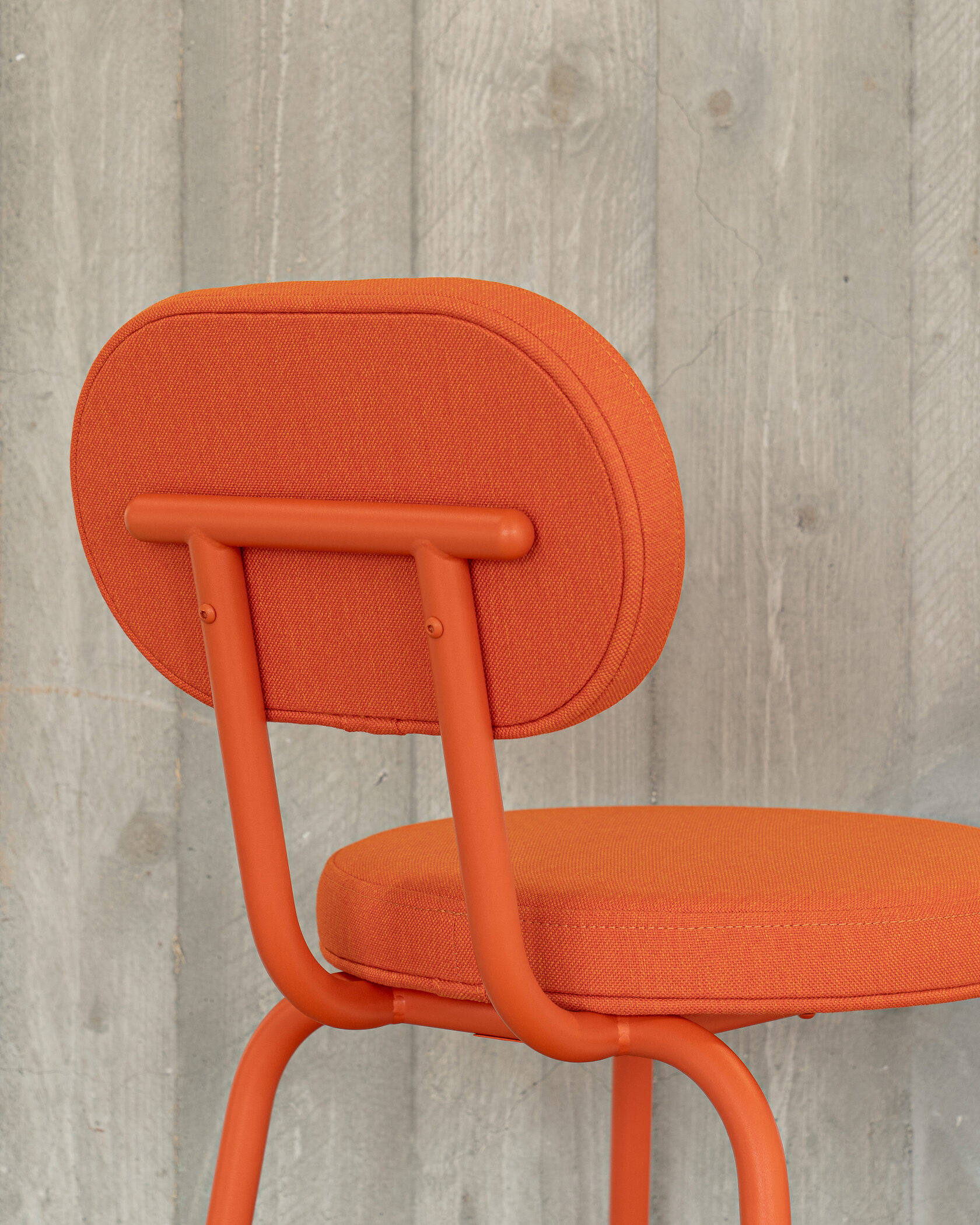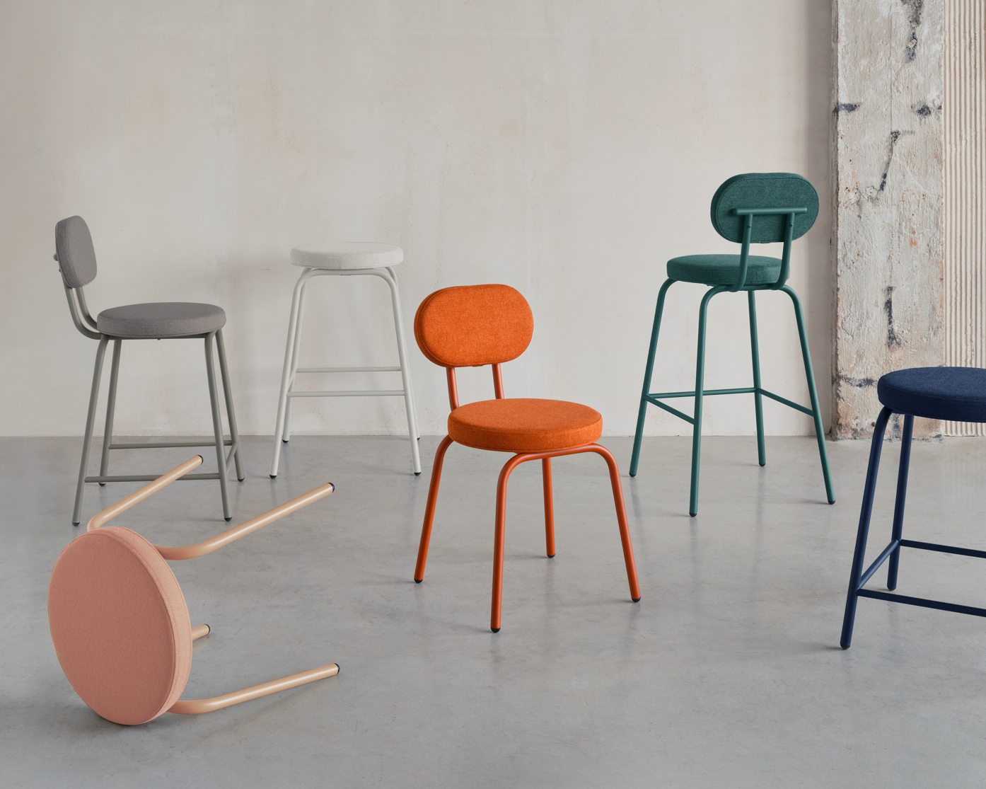 The Tru collection offers upholstered dining and bar seatings. The chairs and stools have solid frames made of bent metal tube. Items are durable and suitable for use in both private and public spaces.