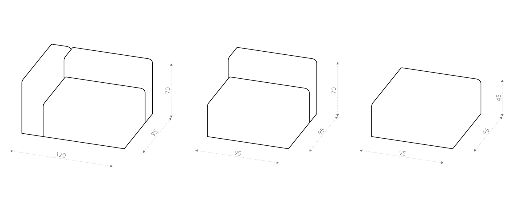 Chill sofa can be combined from any number of modules. There are three types of modules: basic, with back and corner module.