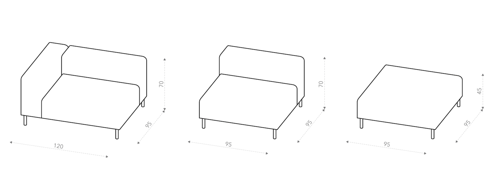 Chill sofa can be combined from any number of modules. There are three types of modules: basic, with back and corner module.