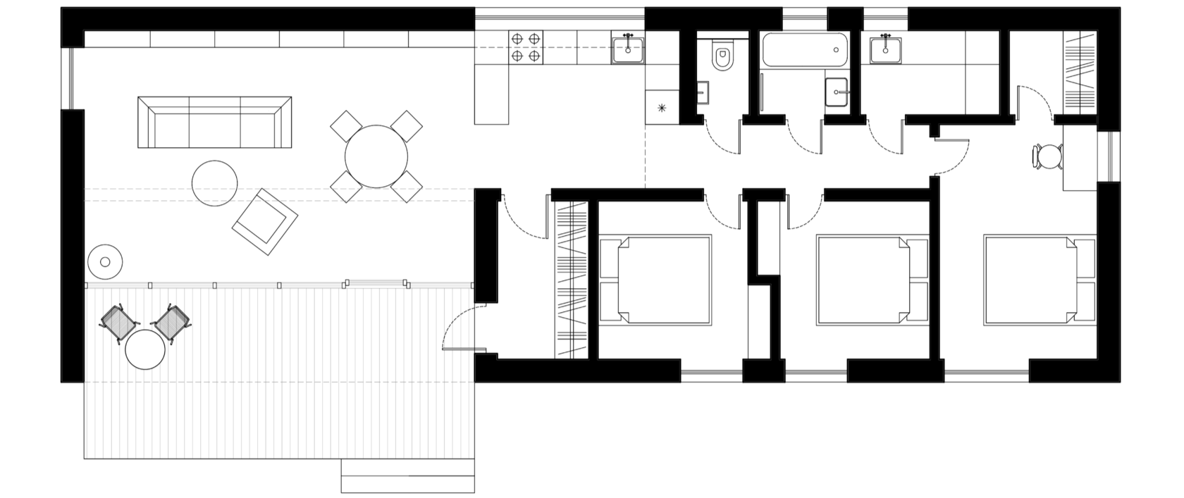 The layout can be mirrored in any direction, and the windows can be positioned depending on the cardinal points, the desired view and the access way.