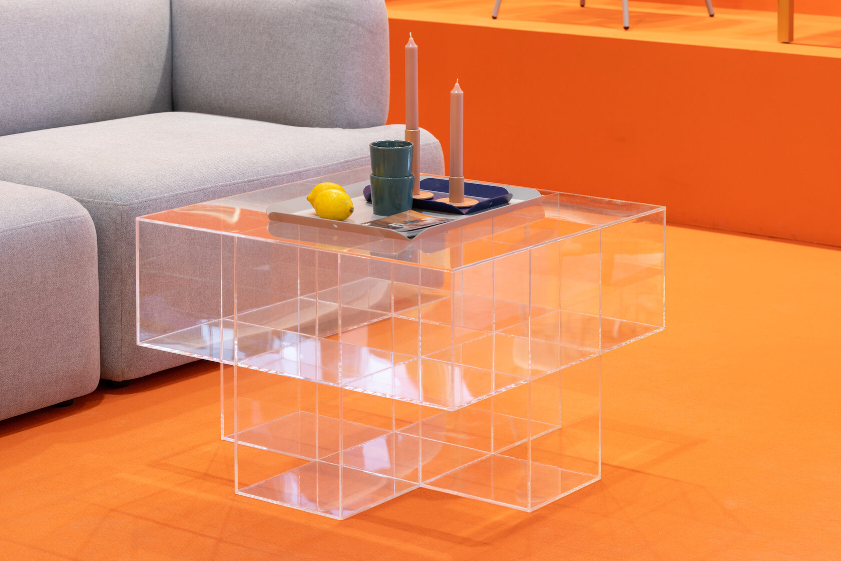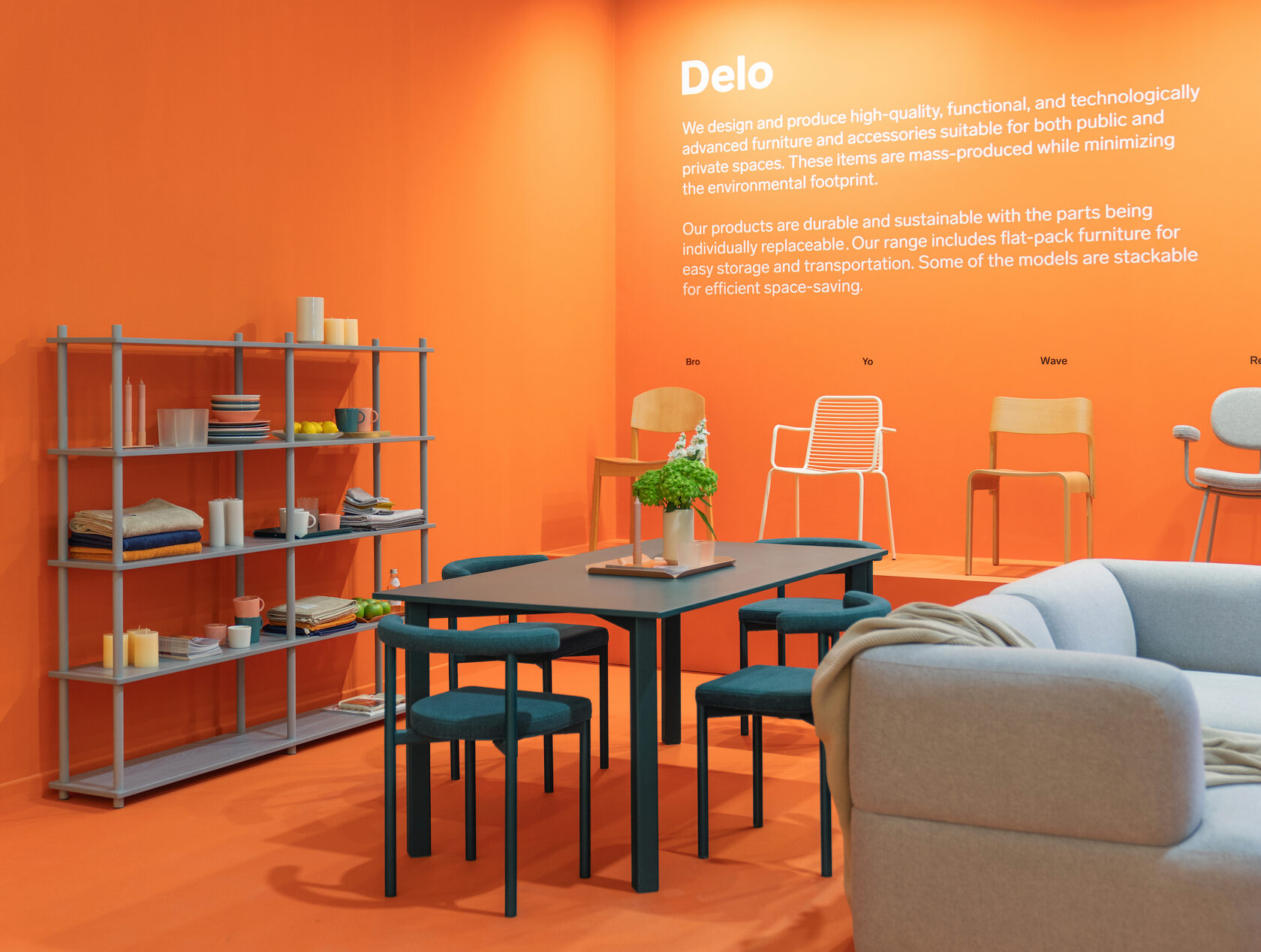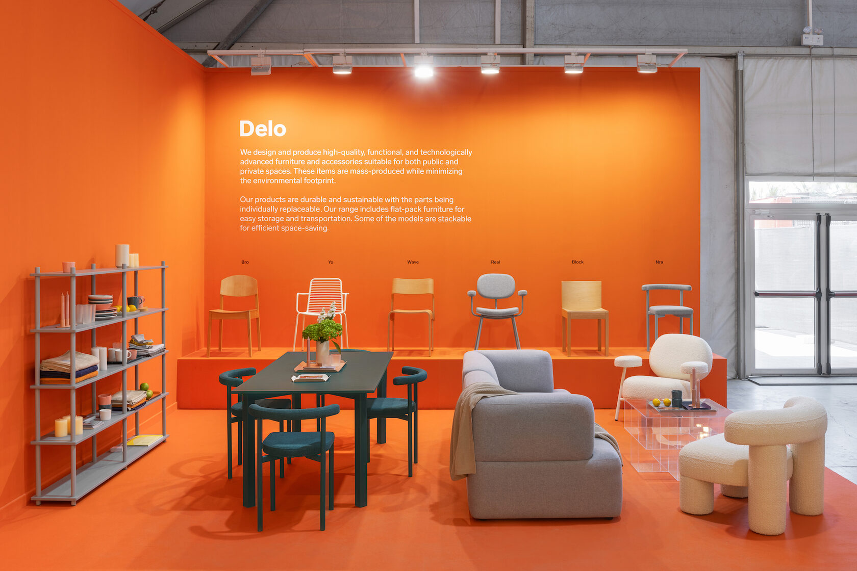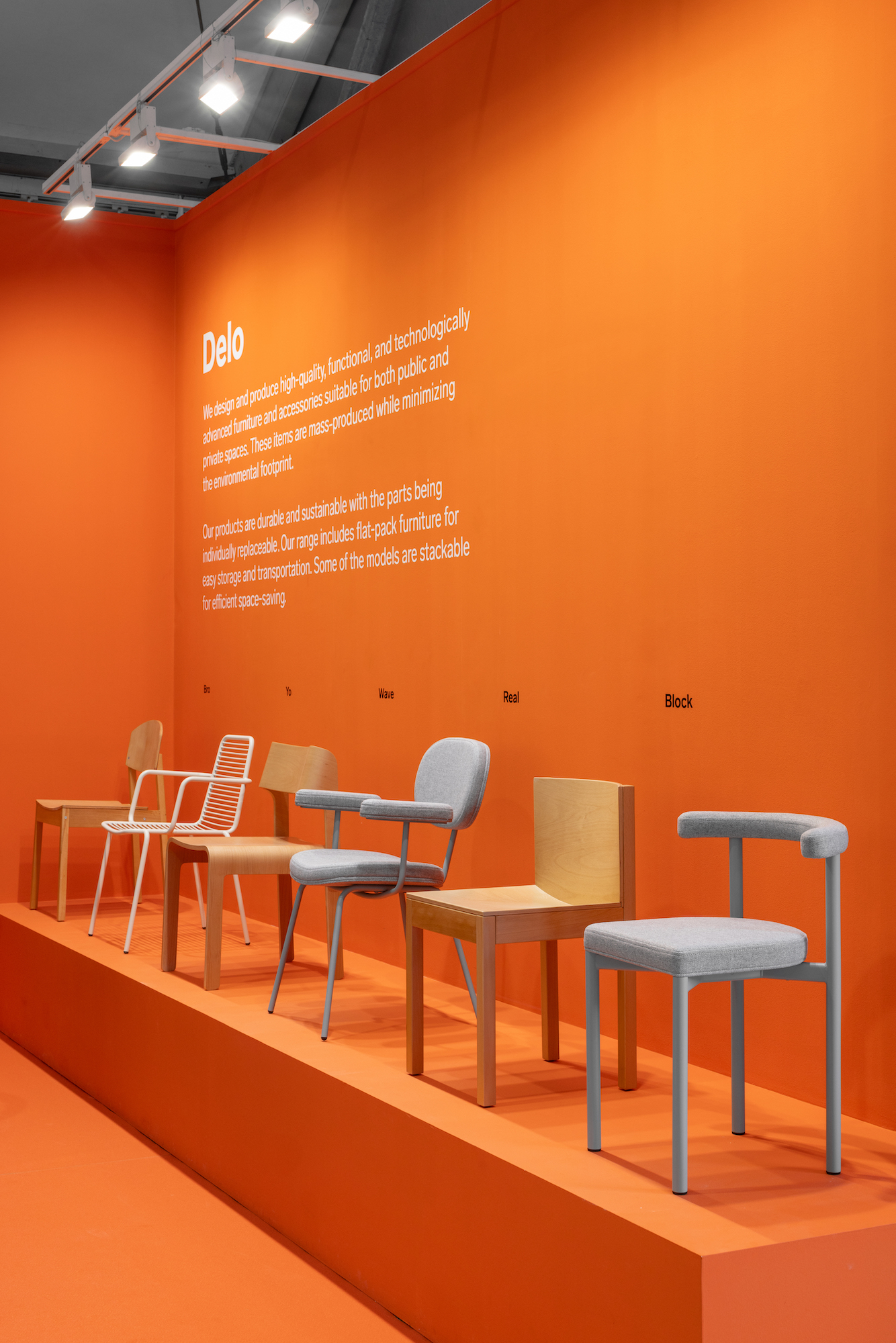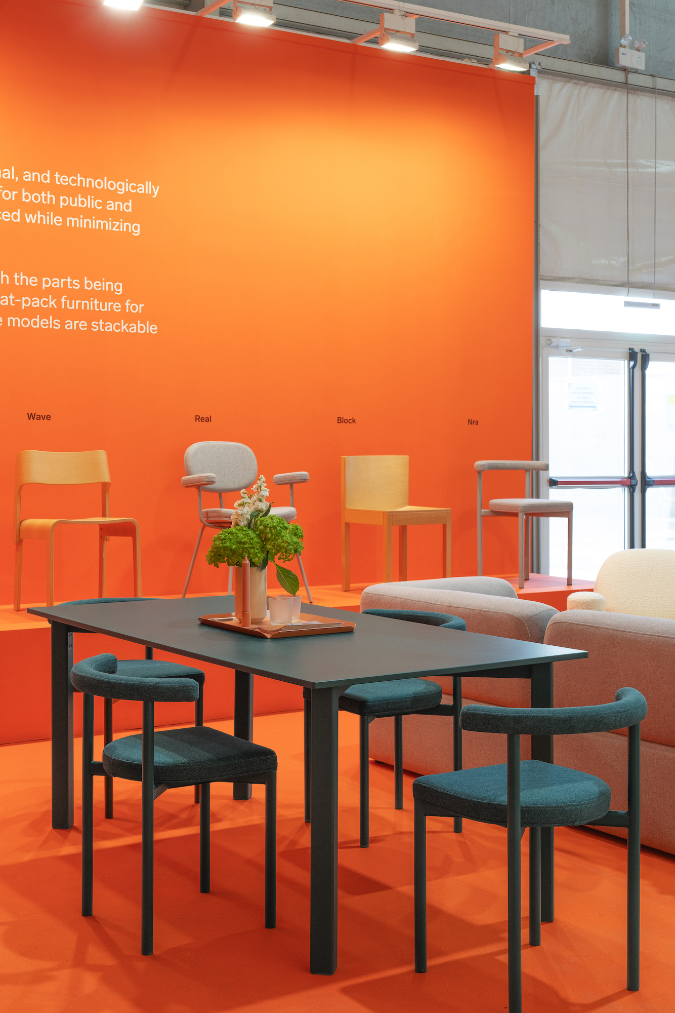 All presented items were manufactured in Turkey — new wooden chairs, Block and Wave, an updated version of the stackable outdoor Yo chairs, an updated model of the dismountable Nra chair with a soft back, Bro chair, Kaef and Nra armchairs, Stolster table, modular Stil sofa, shelving system, and a plastic coffee table specially produced for the exhibition.