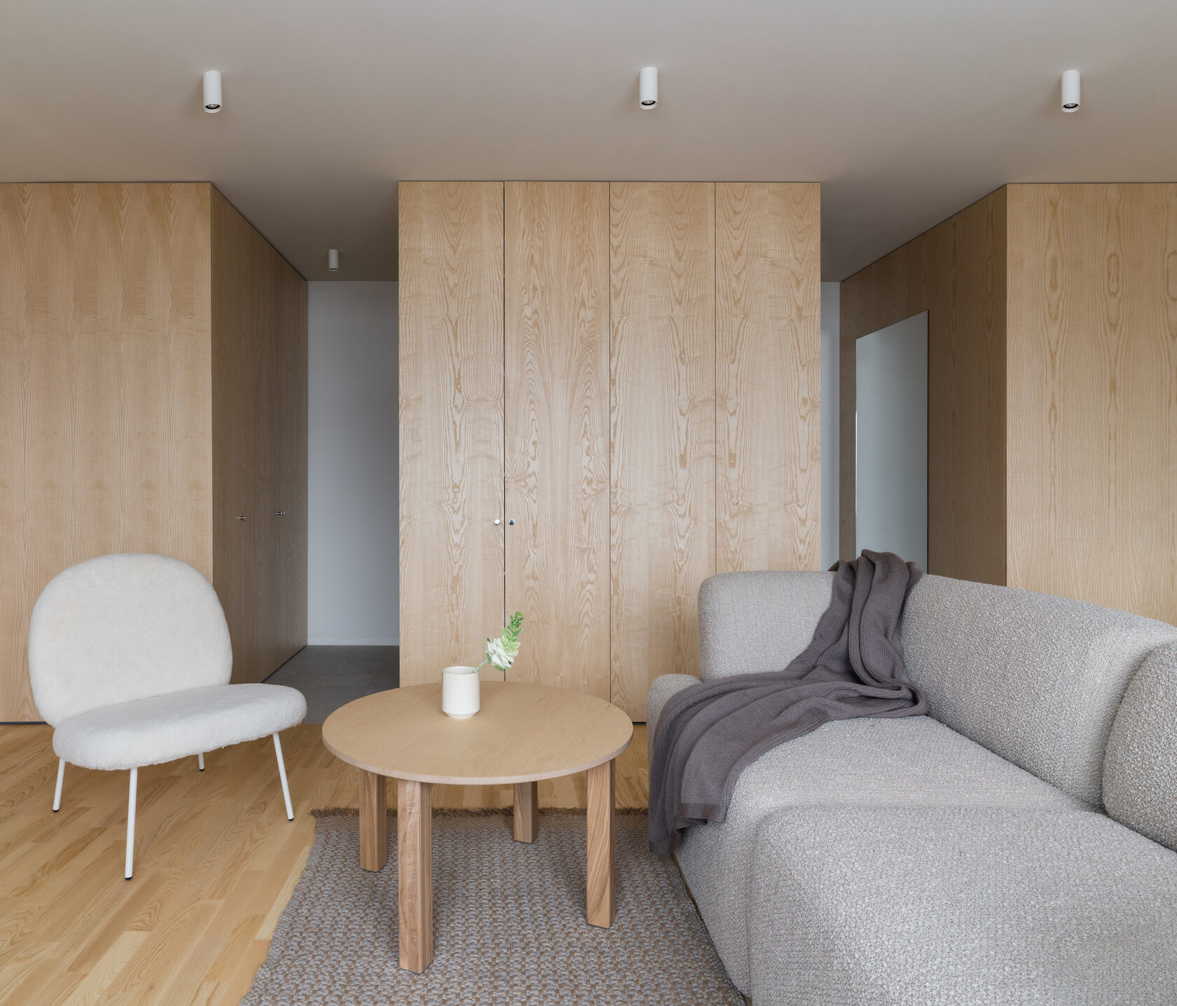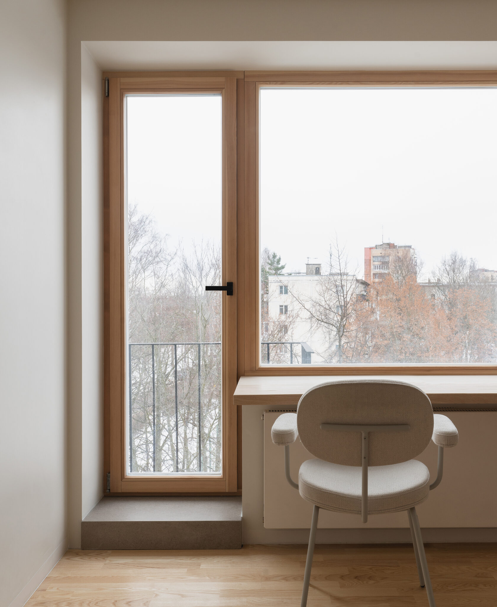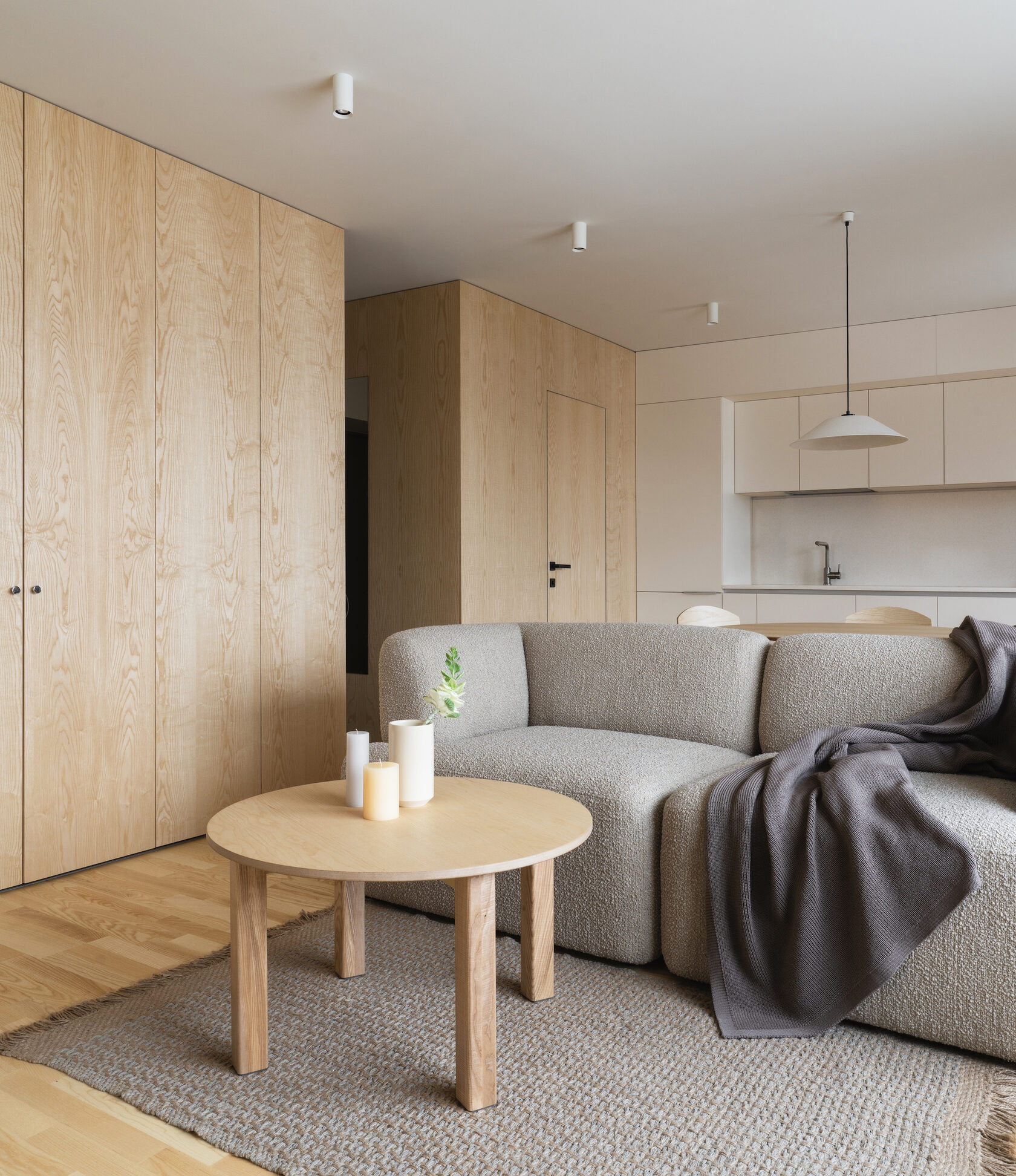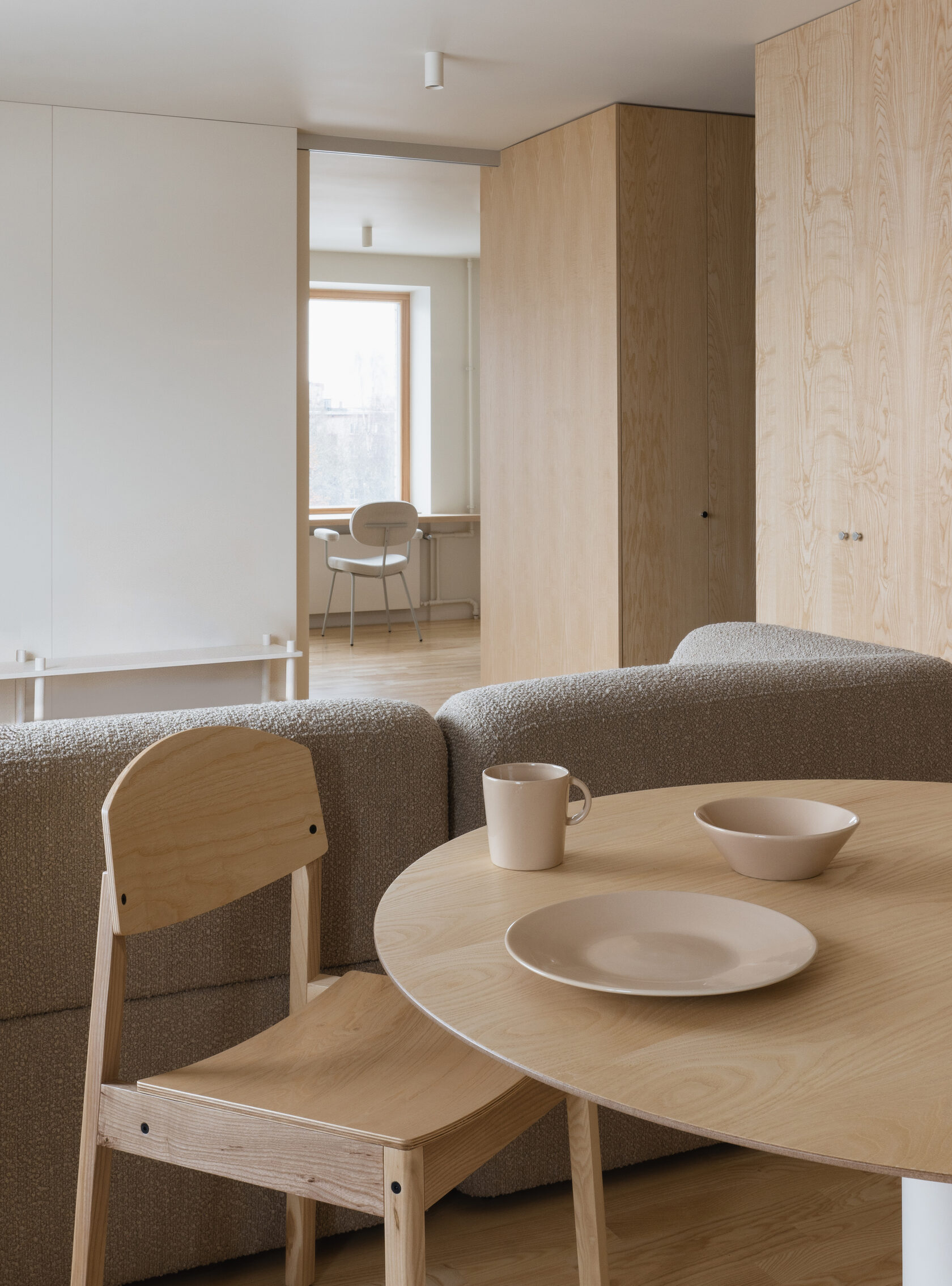 An example of how a small apartment in a typical Soviet nine-story building can be redesigned and furnished with furniture and household items from the brand. The main material used in the decoration and furniture is ash wood. In the center of the living room, there is a large window overlooking the lake.