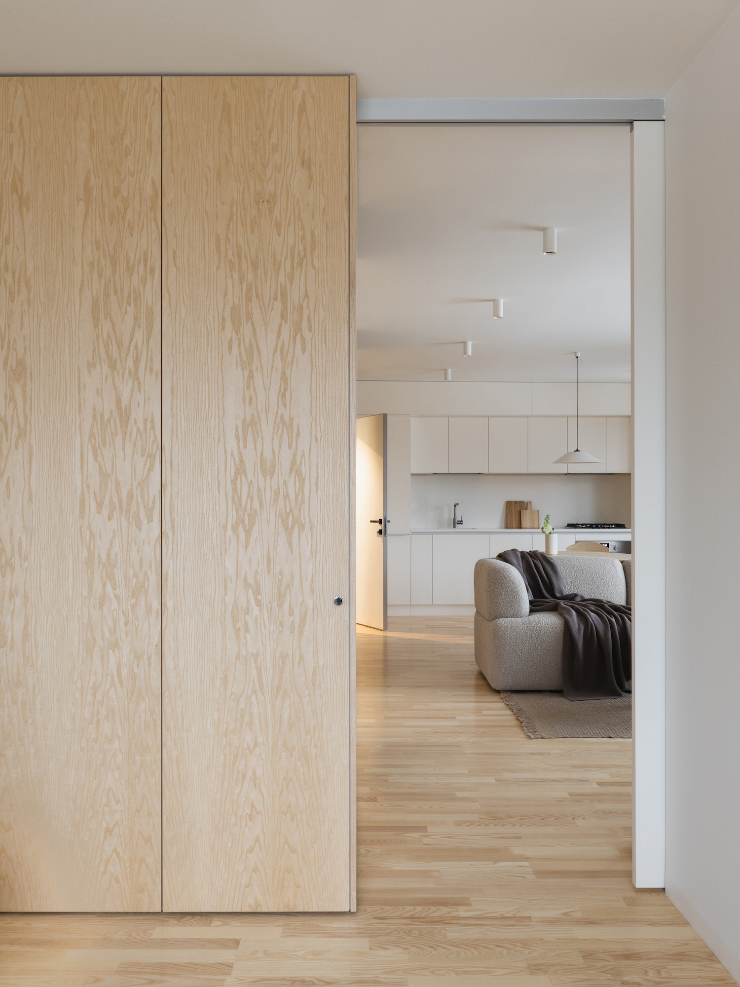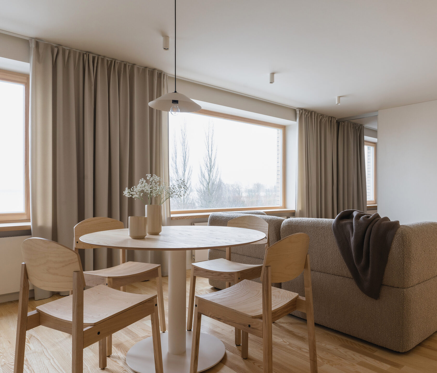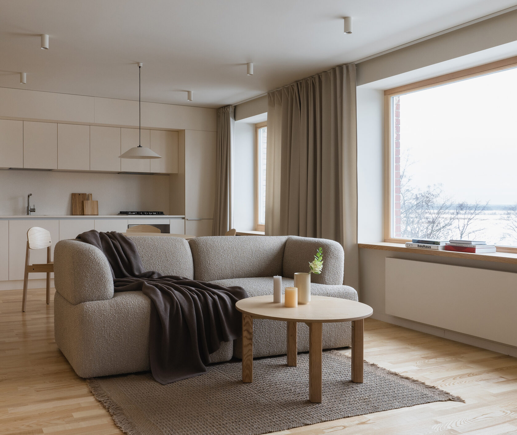 An example of how a small apartment in a typical Soviet nine-story building can be redesigned and furnished with furniture and household items from the brand. The main material used in the decoration and furniture is ash wood. In the center of the living room, there is a large window overlooking the lake.