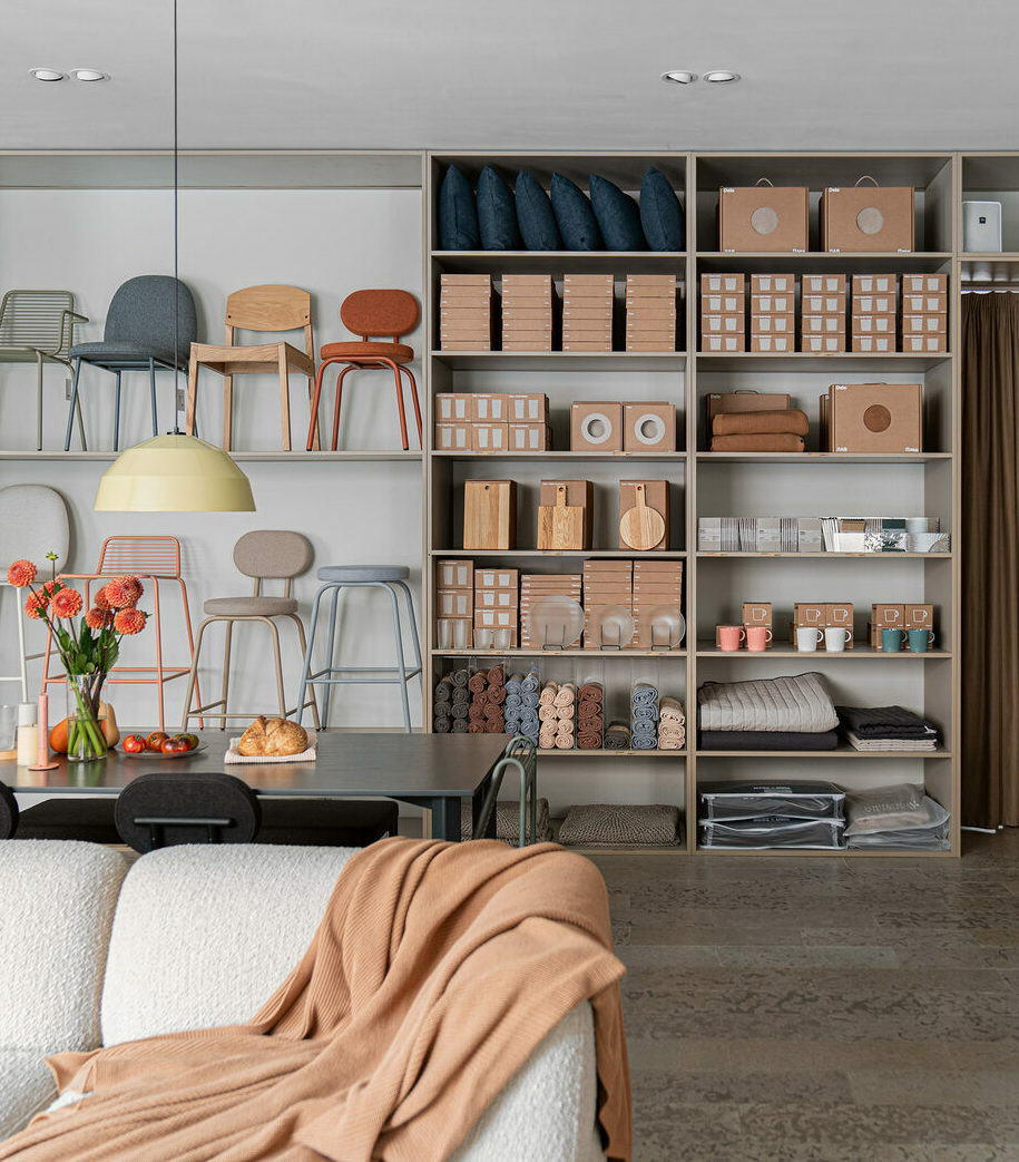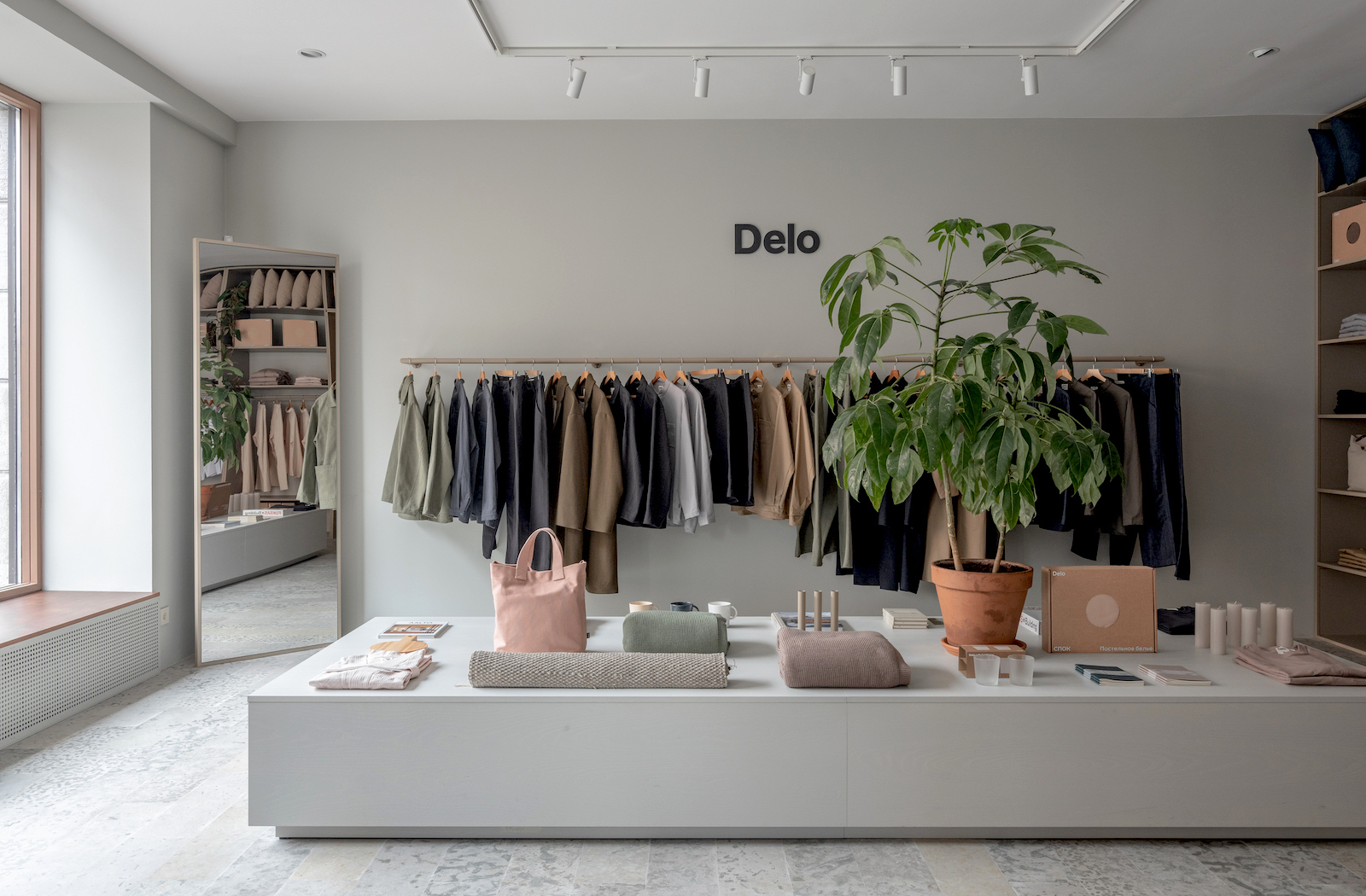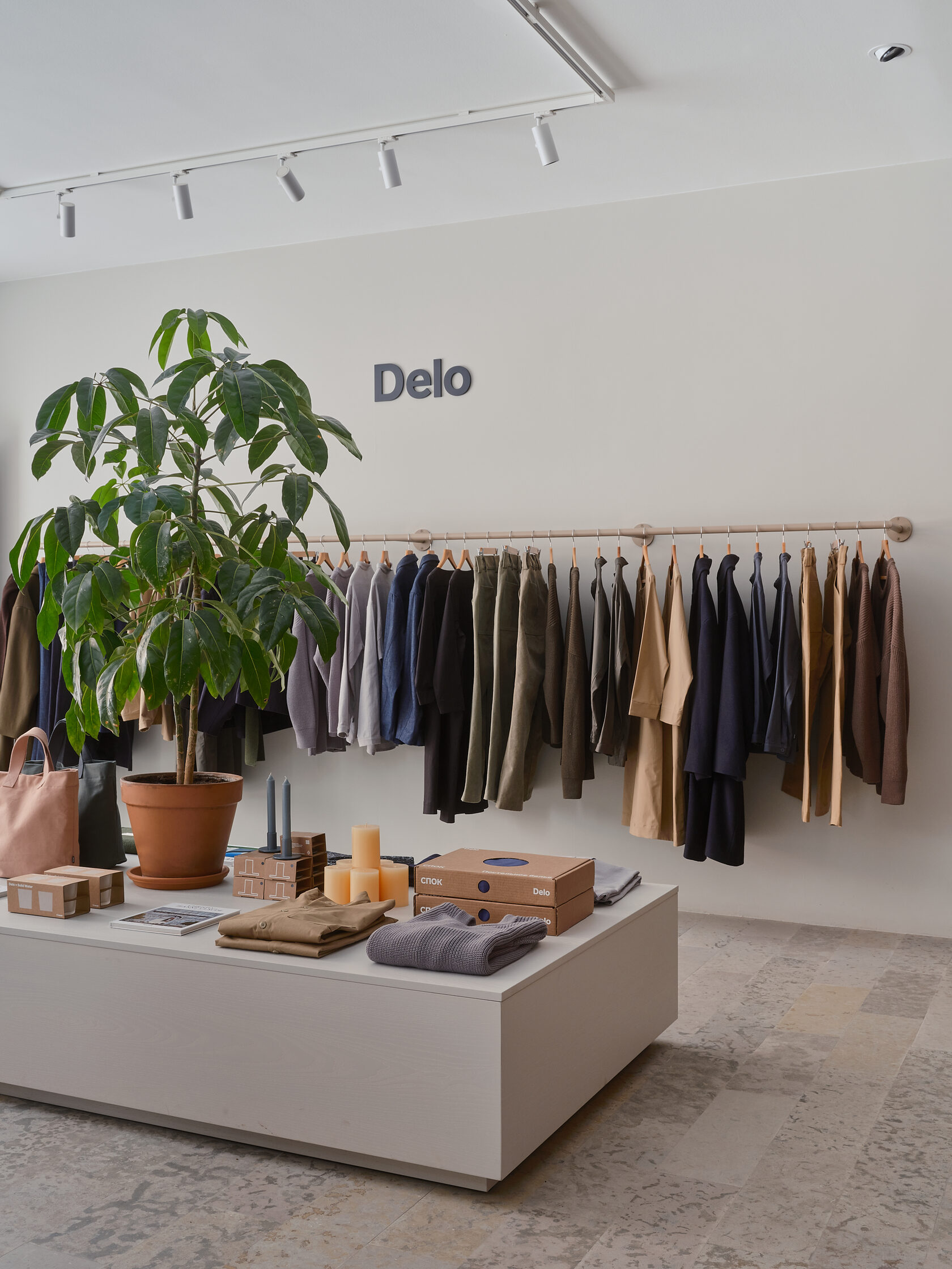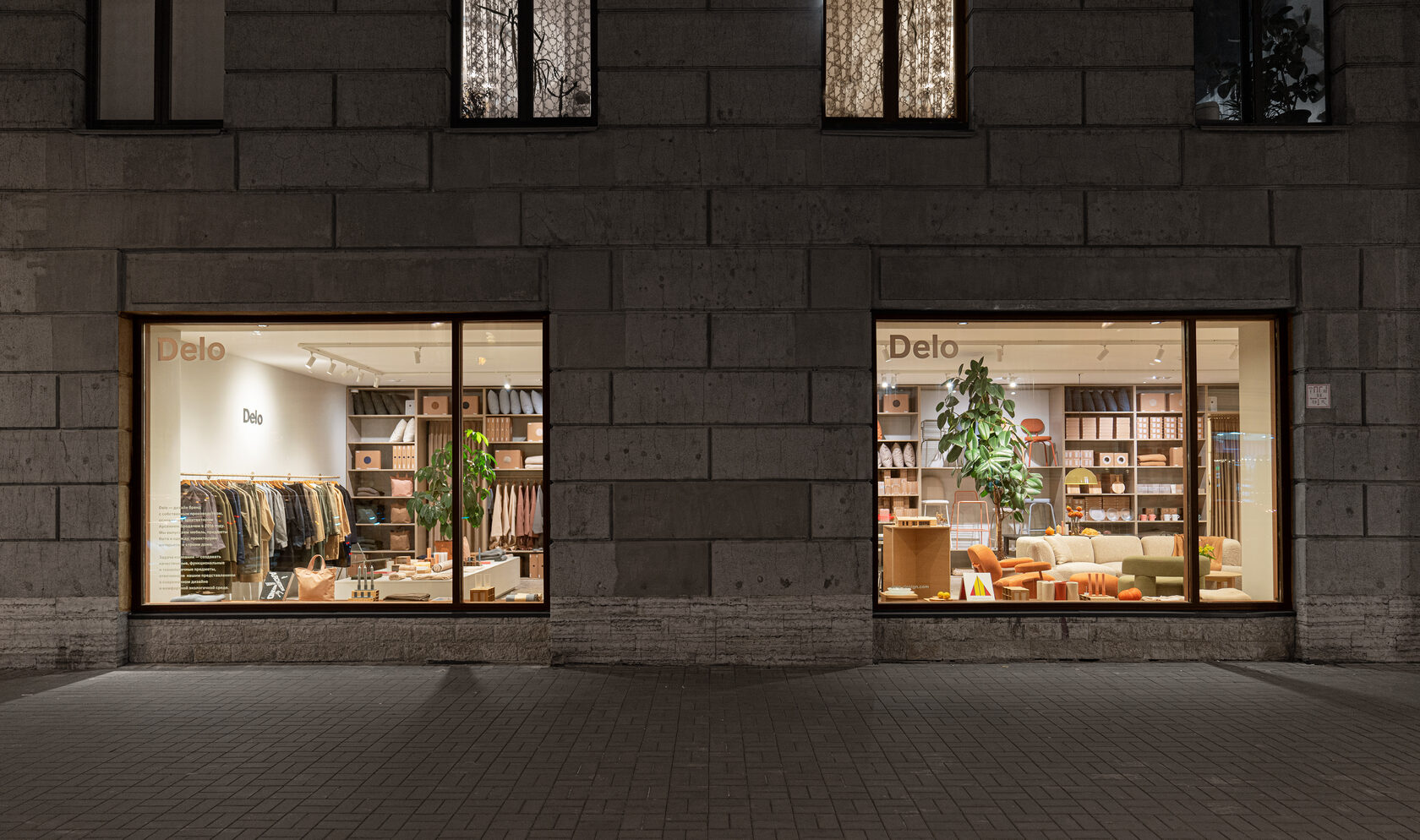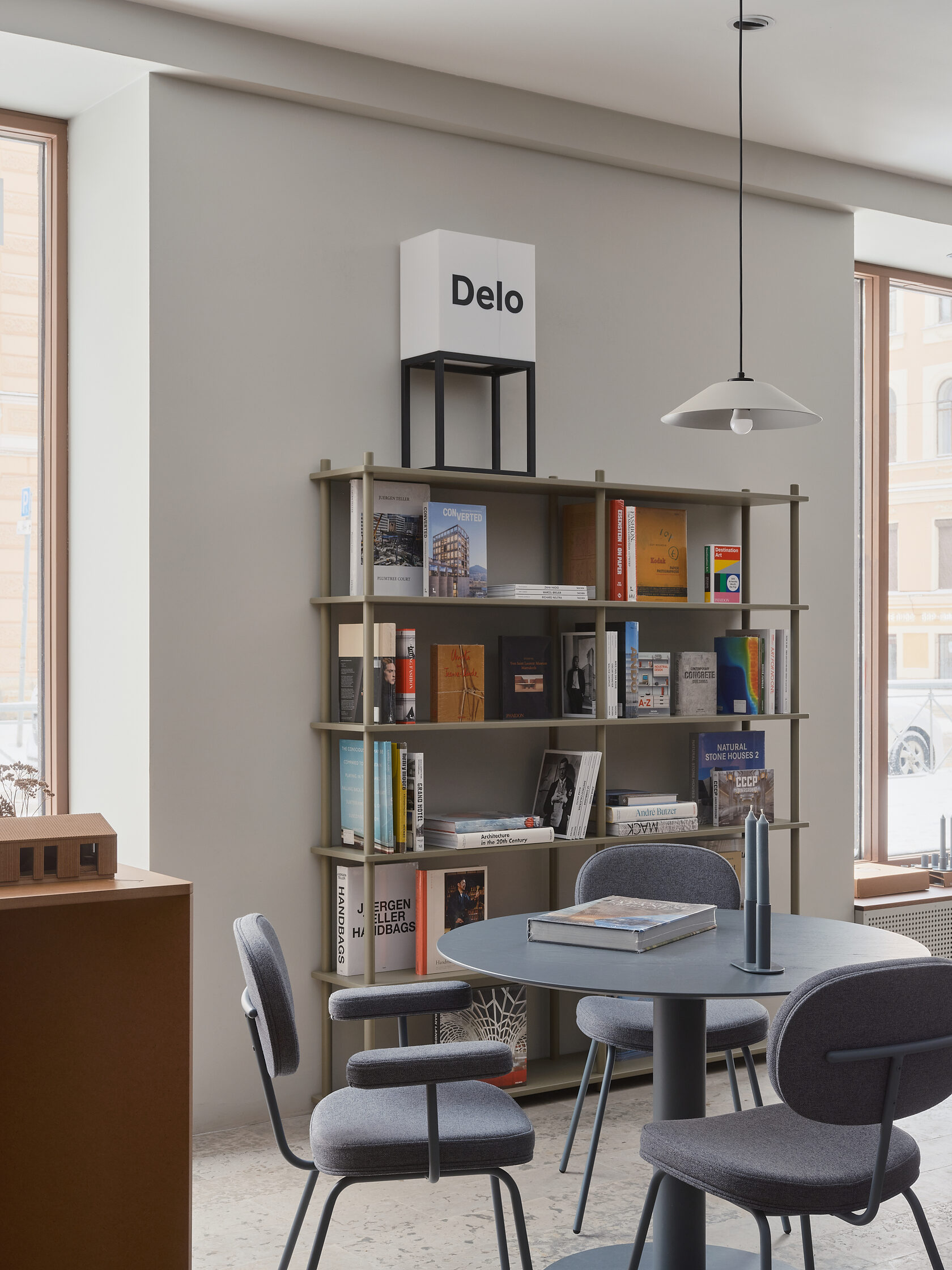 The project combines a showroom and the team's office, showcasing all aspects of the brand's work. It features furniture, household items, and clothing, as well as models of Delo House frame houses and books on architecture and design. The interior is entirely furnished with Delo furniture, including both standard models and specially designed pieces.