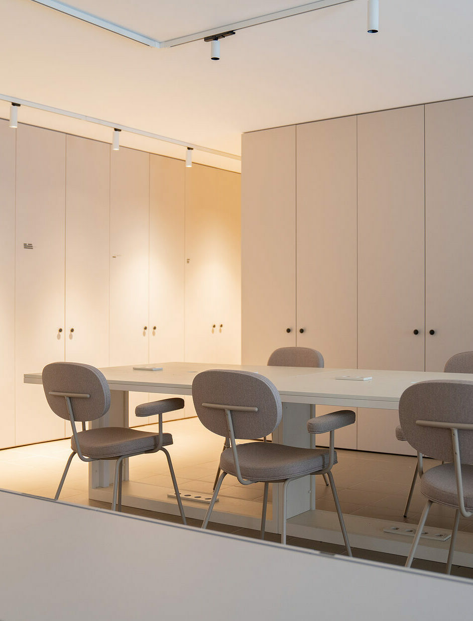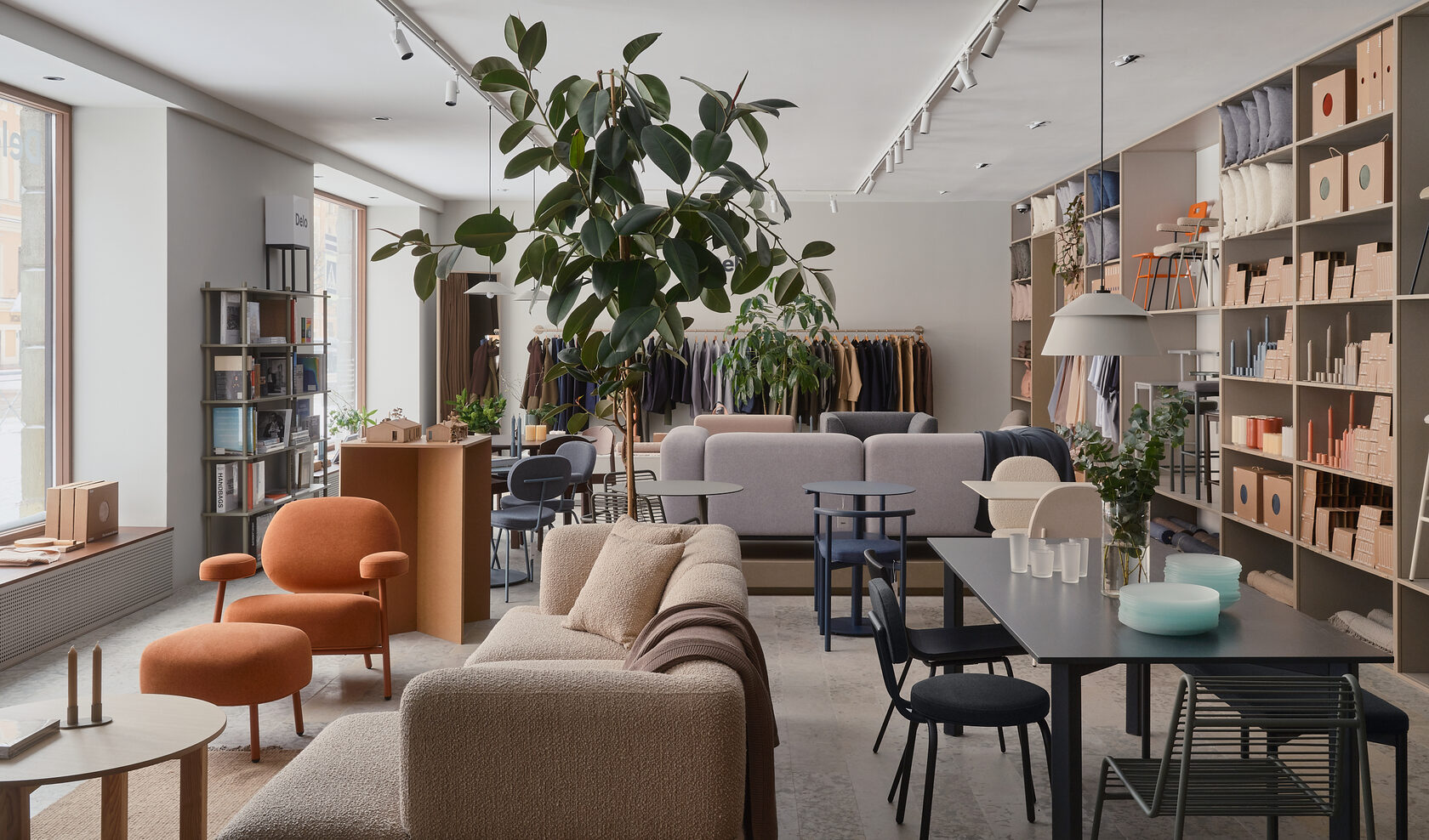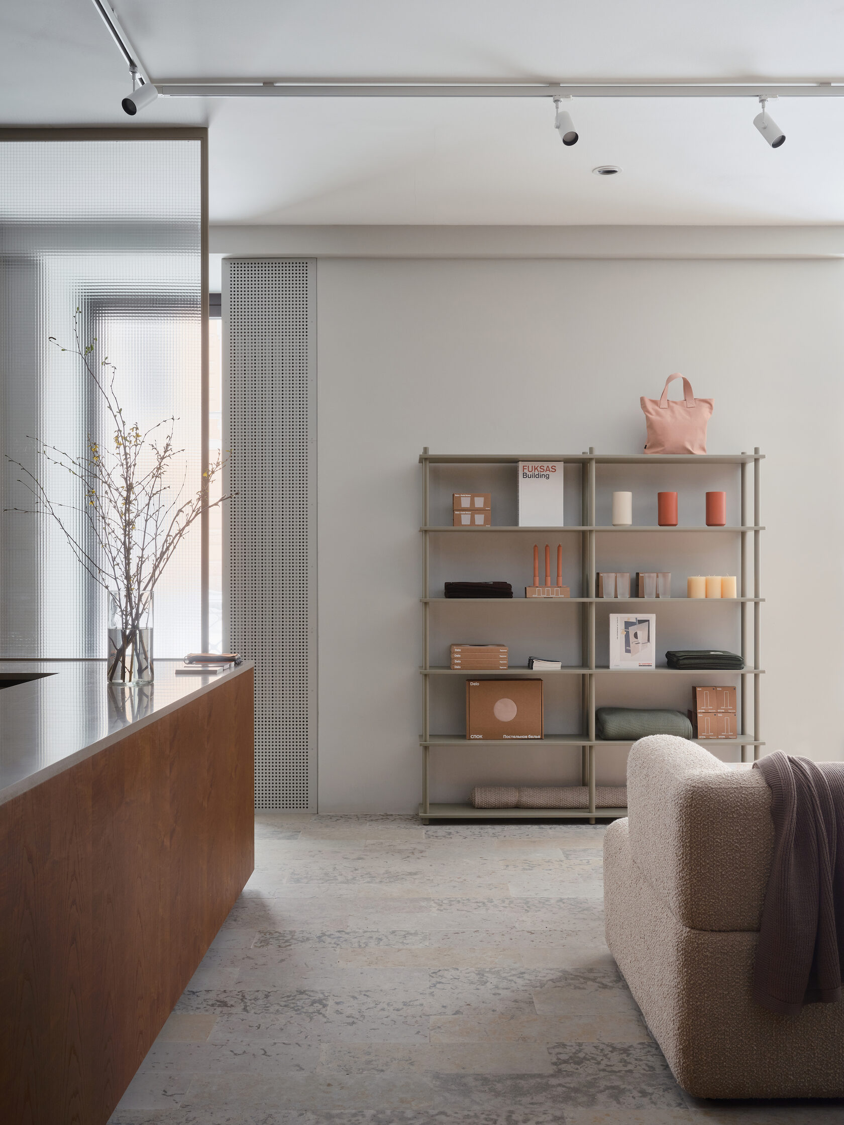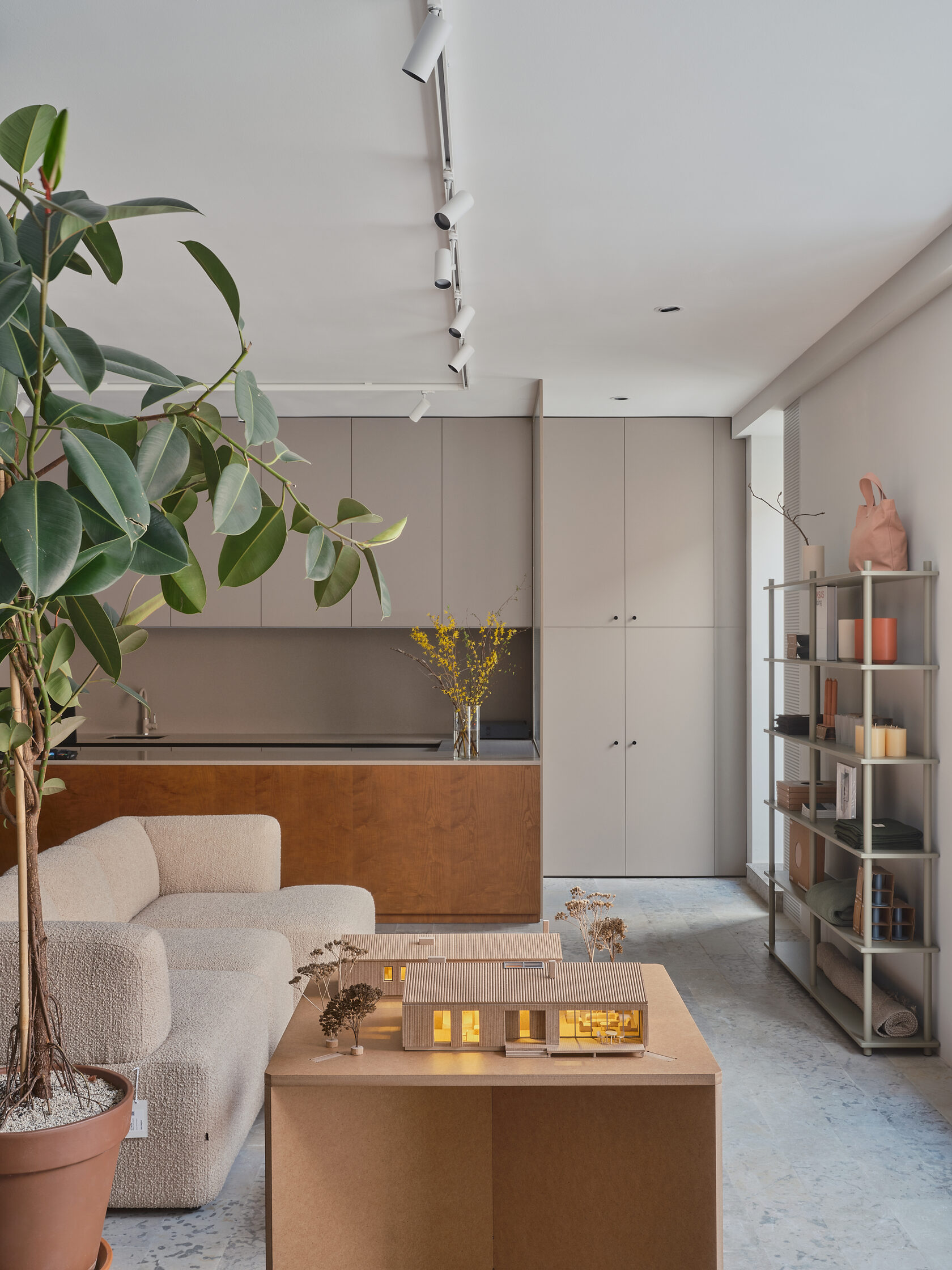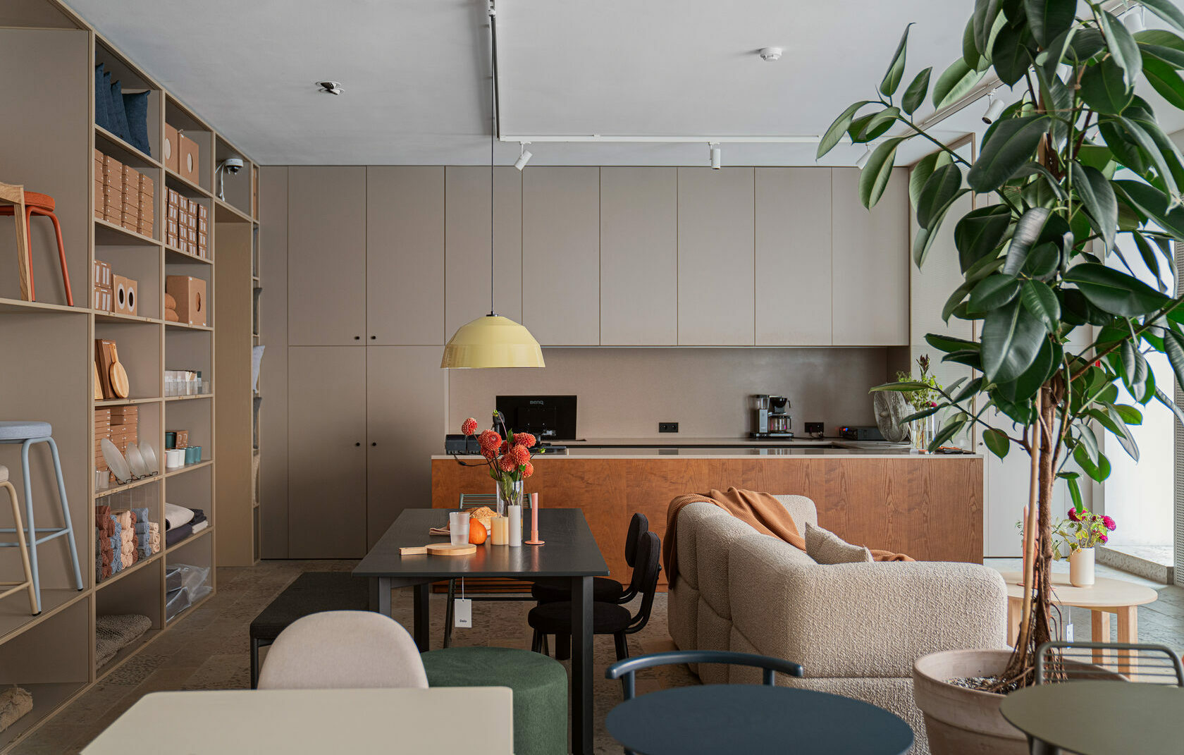 The project combines a showroom and the team's office, showcasing all aspects of the brand's work. It features furniture, household items, and clothing, as well as models of Delo House frame houses and books on architecture and design. The interior is entirely furnished with Delo furniture, including both standard models and specially designed pieces.