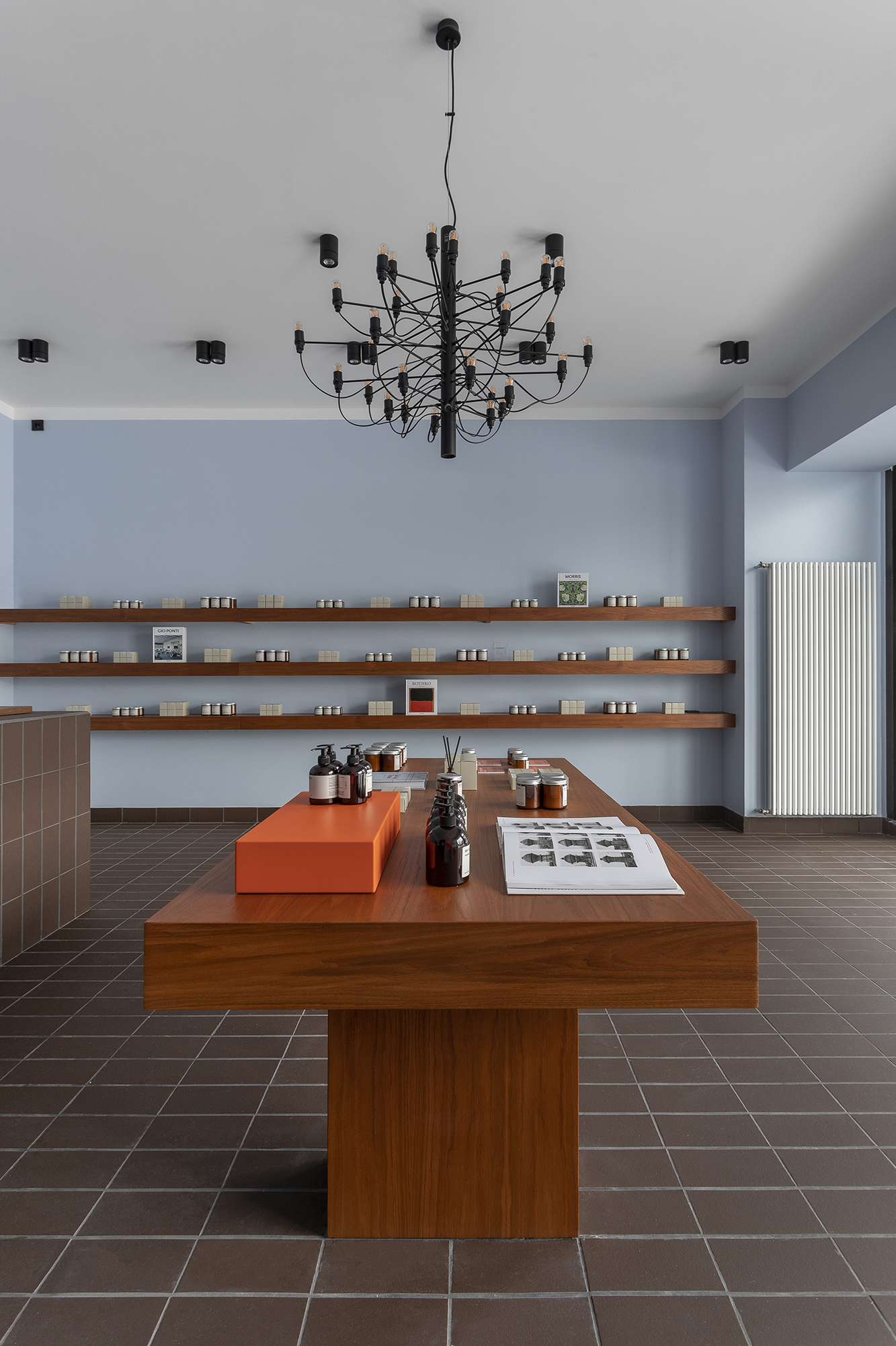 The spatial composition is symmetrical. The height of the surfaces increases from the shop window to the cash desk, allowing a clear view of the store from the street through the shop window.