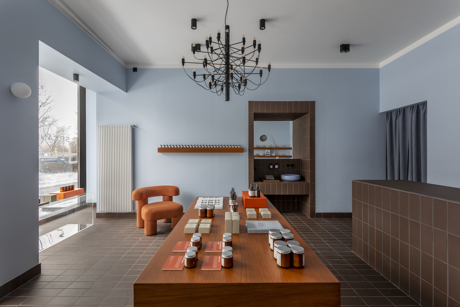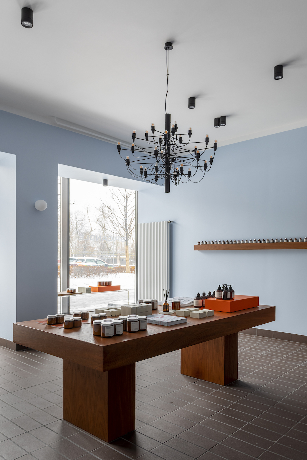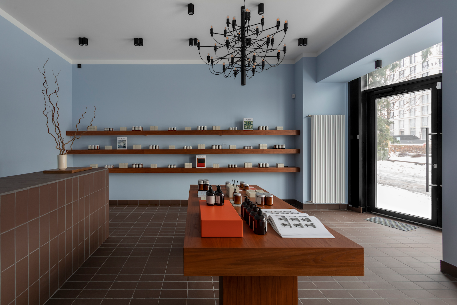 The store is located on the ground floor of a building from the 1950s, opposite the Gorky Park. Through large windows, on a small area of 40 m², there are wall shelves for goods, a cashier's desk, a table for seasonal merchandising, and a sink area.