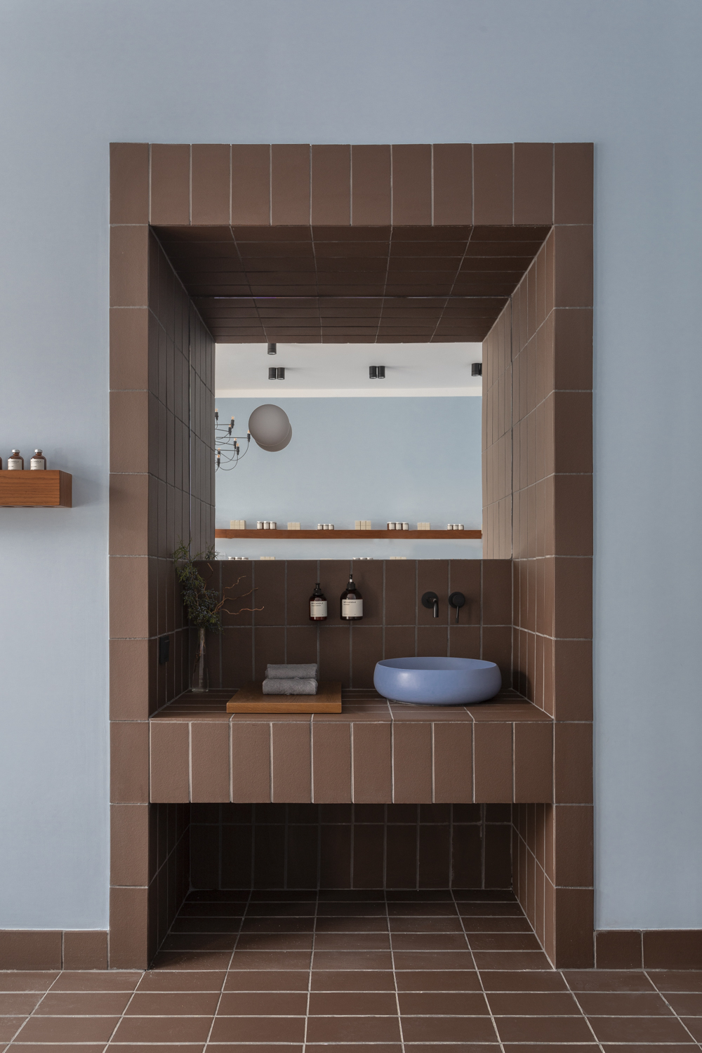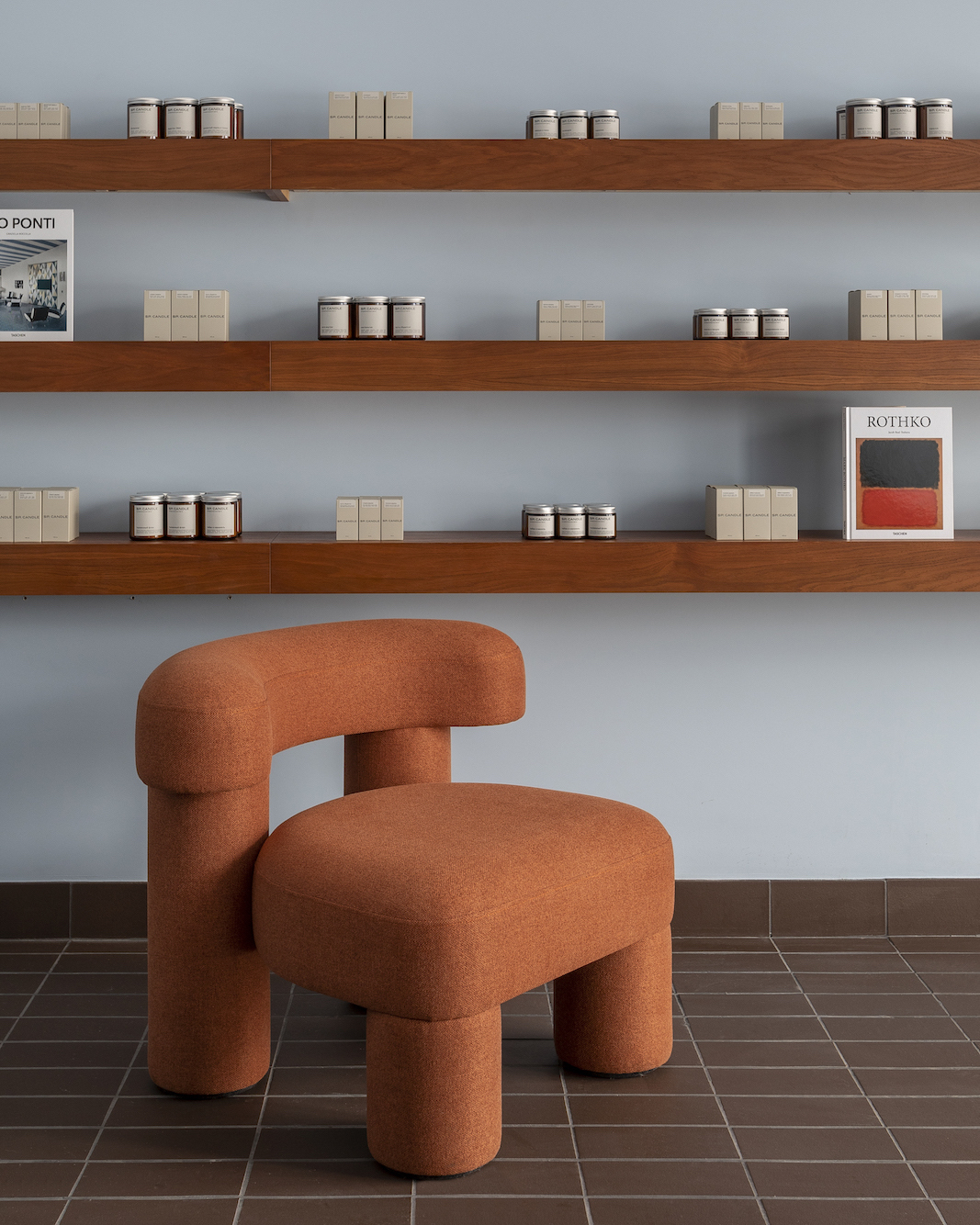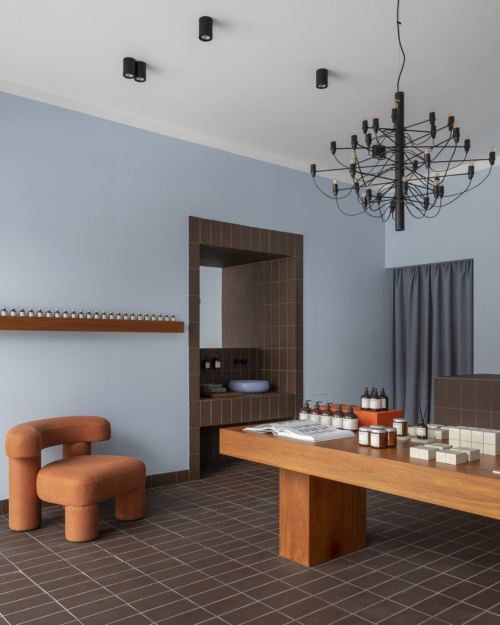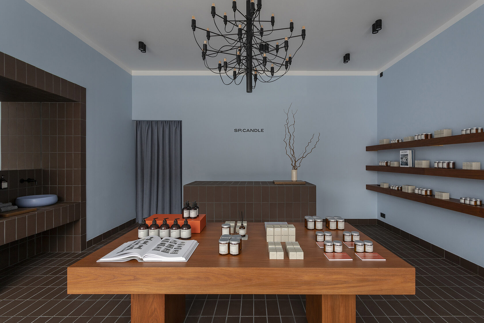 The store is located on the ground floor of a building from the 1950s, opposite the Gorky Park. Through large windows, on a small area of 40 m², there are wall shelves for goods, a cashier's desk, a table for seasonal merchandising, and a sink area.