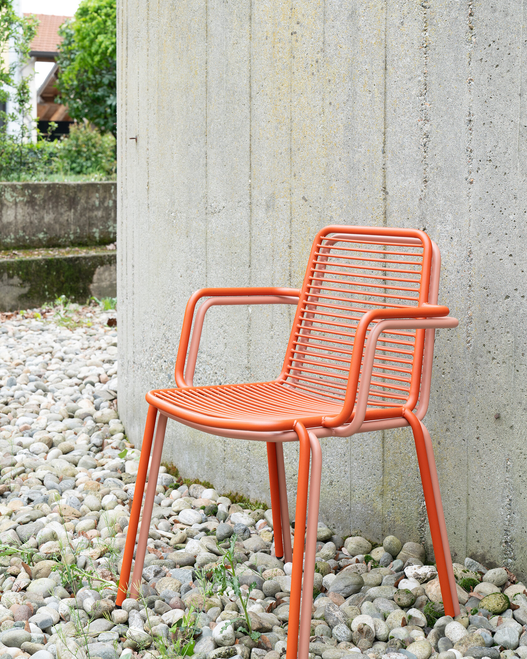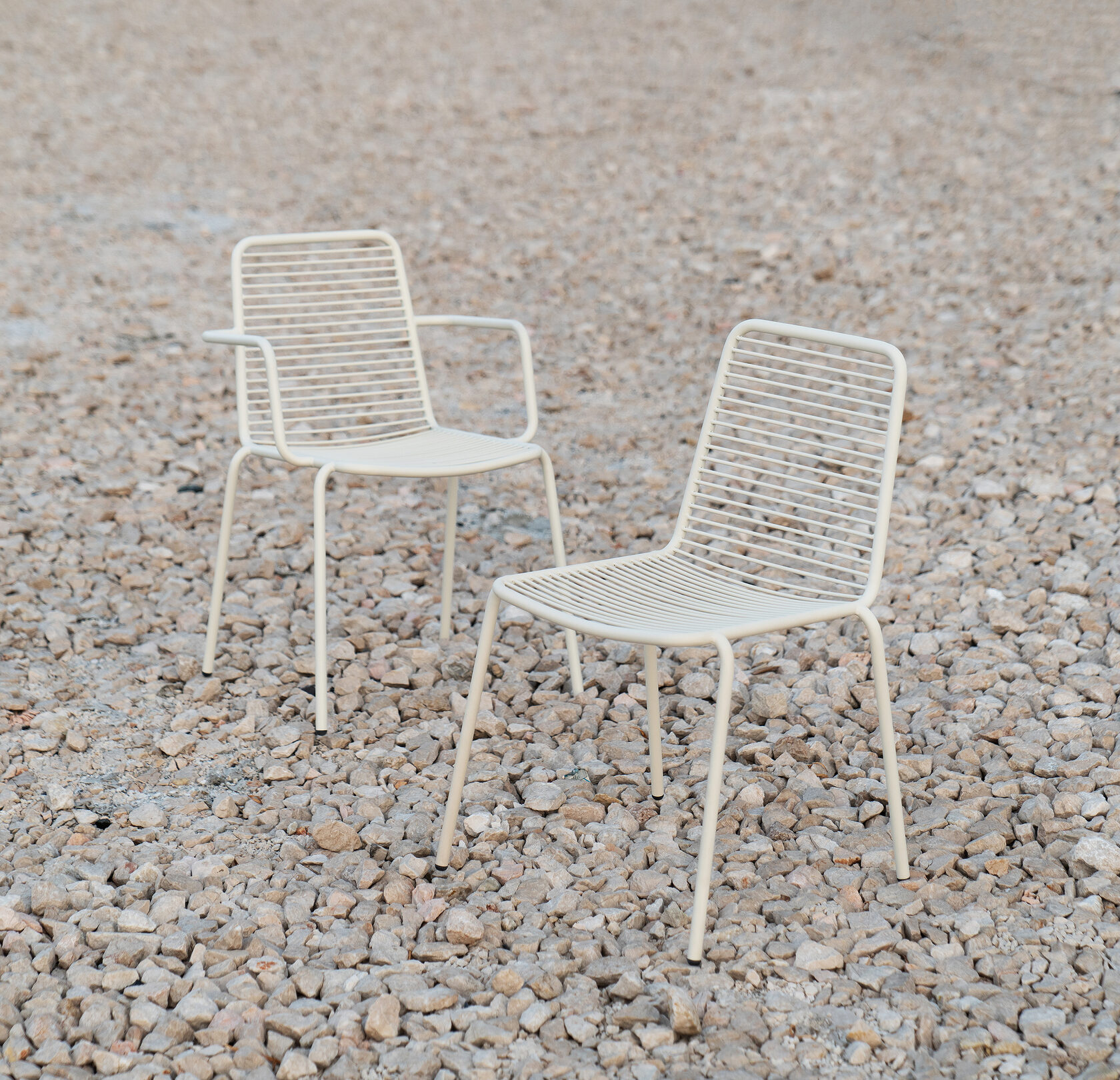 Yo collection consists of outdoor metal furniture: quick-drying chairs with or without armrests. It's surface is resistant to environmental effect . Lightweight chairs are easy to stack.